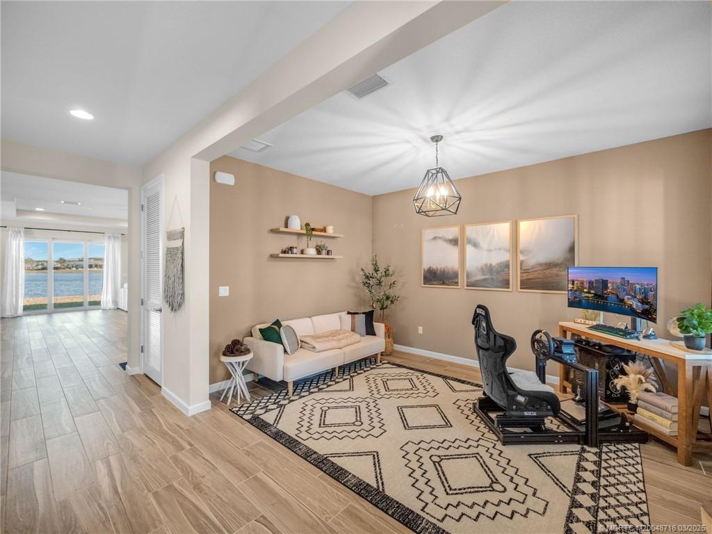 Price improvement, sellers are motivated! Perfection in Port St. Lucie! This lakefront home is brimming with custom details in this coveted Tradition community featuring 2300 sq ft 3 beds/2 baths, plus flex room that could easily be converted into a 4th bedroom. It's open floorplan lends itself to entertaining with it's dry bar/wine room adjacent to the dining, kitchen and family room, all facing the widest part of the lake. The kitchen boasts Calacatta Halo Quartz countertops, gourmet Whirlpool appliances with a 36" refrigerator, custom furniture piece island and a walk-in pantry with wood shelving. Relax in the family room in front of the custom shiplap entertainment wall, a marble surround fireplace with wooden mantle, and coordinating floating shelves. Additional highlights include laundry room with a built-in seating bench featuring storage, hooks with board & batten walls, a new epoxy garage floor & fresh paint throughout. Patio views of rocket launches and city fireworks!